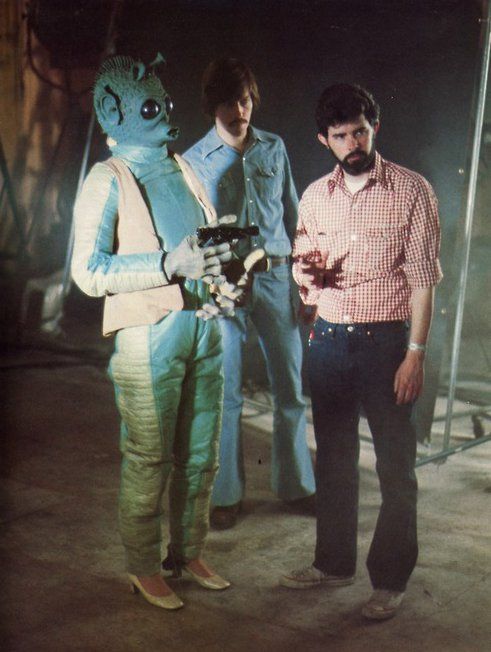 Pour l'anecdote et celles / ceux qui l'ignorent : Greedo fut également incarné par une femme, lors de scènes supplémentaires tournées aux Etats-Unis en 1976. Son nom est Maria de Aragon. Ci-dessous, une petite photo backstage...Admirez les chaussures à talons de la dame.