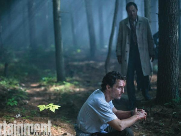 Une forêt obscure, un rayon de lumière... Matthew McConaughey au premier plan, ensanglanté et moustachu. En arrière plan, Ken Watanabe dans la pénombre et en imper. Une photo bien mystérieuse pour Sea of Trees de Gus van Sant !