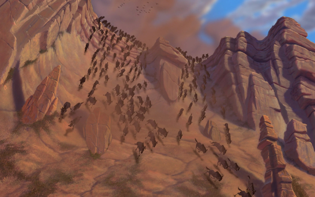 La spectaculaire séquence des gnous dévalant le défilé a demandé 3 années de travail à l’équipe du film, ainsi que l’élaboration d’un tout nouveau programme informatique capable de faire courir des centaines de personnages simultanément sans qu’ils n’entrent en collision.