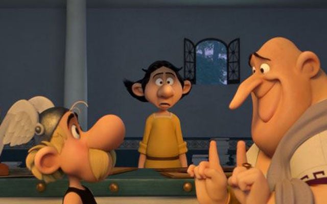 Ce petit Romain à l’air désemparé que vous voyez entre Astérix et le Sénateur Prospectus, c’est Anglaigus ! Pour sa première apparition sur grand écran, ce jeune et timide architecte chargé de la construction du domaine des dieux est interprété vocalement par l’acteur Lorànt Deutsch.