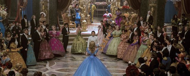 Il ne nous faut pas longtemps pour comprendre pourquoi l'équipe de Cendrillon a réquisitionné le plus grand des hangars de Pinewood, car la salle du trône nous renseigne très vite : une fois le portant avec des bouts de costumes passé, c'est une immense pièce qui nous attend pour nous impressionner à coups de dorures, de tentures, de faux carrelage en marbre (en réalité du bois maquillé) et de miroirs. La partie inférieure de ces derniers est d'ailleurs verte, sans doute pour masquer les éventuels techniciens et caméras dont le reflet apparaîtrait pendant la scène du bal, risquant ainsi de briser la magie du moment.