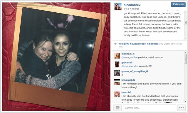 A côté du cliché de Dobrev dans les bras de la productrice Julie Plec, les abonnés du compte Instagram de la comédienne peuvent lire le long message qui leur est adressé. En voici un extrait : "J'ai toujours su que l'histoire d'Elena serait une véritable aventure pendant ces 6 saisons. Et durant 6 ans, j'ai fait un voyage incroyable. Humaine, vampire, double maléfique, folle immortelle, double maléfique prétendant être humaine, humaine prétendant être un double maléfique. J'ai été kidnappée, tuée, ressuscitée, torturée, maudite, hantée, morte puis non morte, et il y a encore tellement de choses à venir avant le Season Finale du mois de mai. Elena n'est pas tombée amoureuse une seule fois, mais deux, de deux âmes-soeurs fantastiques, et personnellement je me suis fait quelques-uns de mes meilleurs amis et j'ai construit une famille que j'aimerai pour toujours." De son côté, Plec a reconnu que dire au revoir à Nina était à la fois "doux amer et beau."