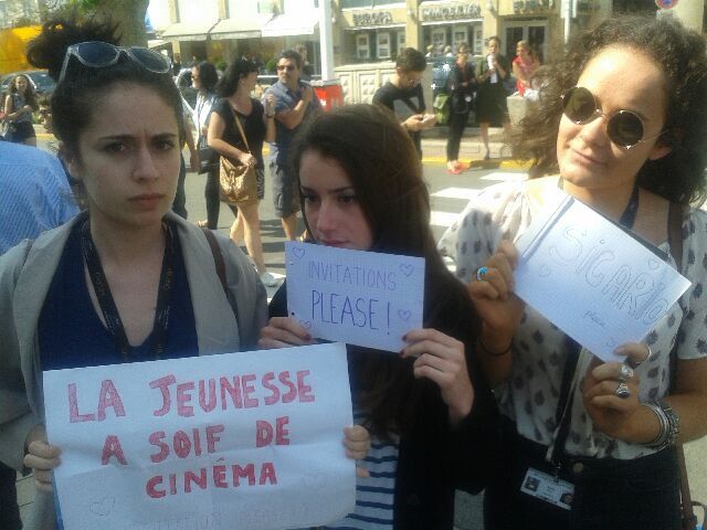 "Invitations, please ! "Need one invitation for tonight" ! "Recherche une place pour le Woody Allen !" Tous les ans, c'est le même drôle de spectacle qui se joue aux abords du Palais des Festivals : des dizaines et des dizaines d'amoureux du septième art font des pieds et des mains pour obtenir le précieux sésame qui leur permettra de monter les célèbres marches cannoises. C'est souvent demandé de manière classique, parfois de manière plus originale, comme le trio composé de Mathilde, Diane et Marie, qui mise sur la jeunesse pour tenter de convaincre les professionnels de leur lâcher une invit'...