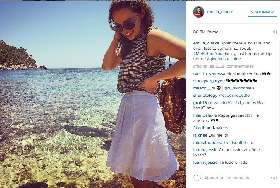 et de la retrouver à l'affiche de Terminator : Genisys dès le 1er juillet, Emilia Clarke prend le soleil aux Baléares ! "En Espagne il n'y a pas de pluie, et pas de raison de se plaindre. A propos du tournage de Me Before You, c'est de mieux en mieux ! #DonnezMoiDuSoleil" poste-t-elle complice avec ses fans sur Instagram...