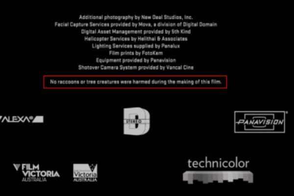 "Aucun raton laveur et aucune créature en forme d'arbre n'ont été blessés durant le tournage de ce film," nous dit-on en fin de générique. Là aussi, on peut en revanche émettre quelques doutes sur l'état de santé des techniciens qui ont cotoyé Groot et Rocket Racoon au quotidien.
