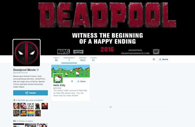 C'est pourtant sur le Twitter officiel du long métrage Marvel que l'on peut découvrir la passion du personnage masqué pour le chaton au noeud dans les cheveux. Ainsi, si le compte de followers ne cesse de grimper pour Wade Wilson (142 000 au moment de cette capture), un seul abonnement est activé sur sa page : la page officielle de Hello Kitty !