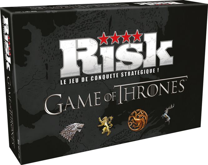 Pour les 80 ans de la marque Hasbro est à présent disponible le Monopoly Game of Thrones. Le projet avait été annoncé en février dernier, il est désormais concrétisé. Pour les plus belliqueux, une version du jeu de plateau Risk à l'effigie de la série est également en vente. Le but : conquérir Westeros (à 3 ou 5 joueurs) ou les terres d'Essos (à 2 joueurs), mais ce Risk peut être aussi être joué jusqu'à 7 participants.