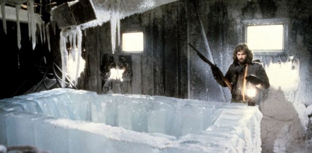 Man is the Warmest place to Hide. "L'homme est l'endroit le plus chaud pour se cacher" proclamait la Tagline sur l'affiche US de The Thing. Alors qu'une terrible tempête de neige s'est abattue sur la station de recherche américaine en Antarctique, l'équipe de chercheurs lutte pour sa survie. Jusqu'à Kurt Russell, qui se sacrifie pour l'Humanité, condamné à mourir de froid. Les extérieurs du film furent tournés au Nord Ouest de la Colombie Britannique, non loin d'une petite ville baptisée Stewart.