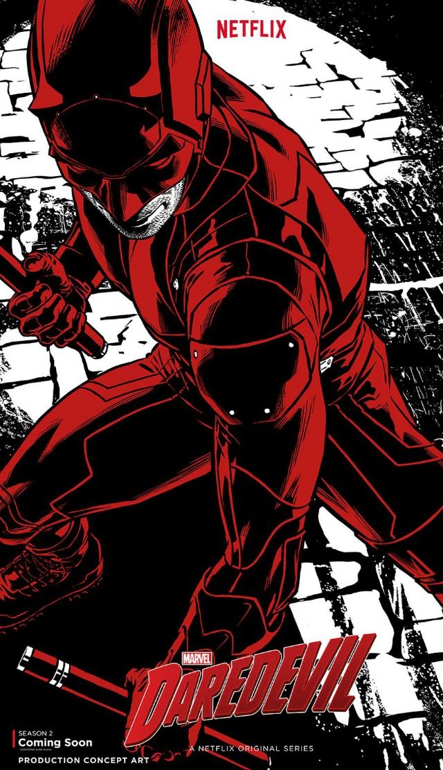 On reconnait le costume rouge et noir de Daredevil, alias Matt Murdock (Charlie Cox) qui tient aussi ses bâtons. Ce concept-art s’adresse donc aux fans et ne doit pas être confondu avec l’affiche officielle de la saison 2 de Daredevil – pas encore dévoilée. Les nouveaux épisodes, actuellement en tournage, devraient être disponibles sur Netflix mi-2016.