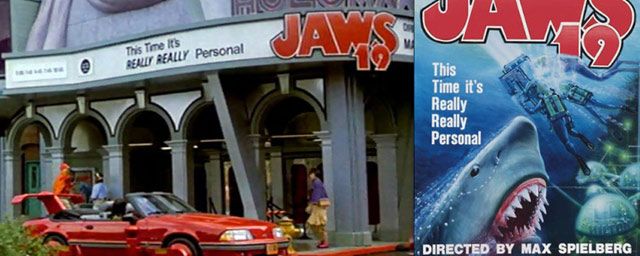 Un petit clin d'oeil à Steven Spielberg, producteur exécutif de la saga Retour vers le futur, est présent lors d'une scène en 1955. Dans un plan, un cinéma propose à l'affiche les films A boy's life (titre de travail de E.T. l'extraterrestre) et Watch the skies (titre original de Rencontres du 3e type). Mais il y aussi Les Dents de la Mer 19 et son affiche holograhique impressionnante.
