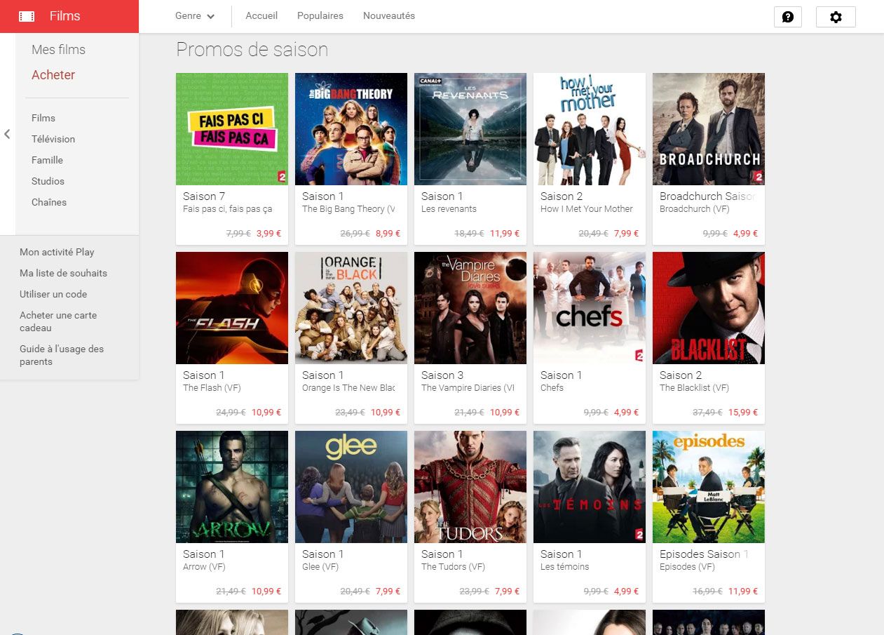 Les séries s'invitent chez Google Play ! Après la musique, les films et les jeux vidéos, la plate-forme en ligne étend son catalogue numérique aux séries télévisées via la rubrique "Télévision". Grâce à des partenariats avec des studios de production internationaux ou des distributeurs indépendants, l'offre comprend des programmes français (Chefs, Fais pas ci, Fais pas ça, Les Revenants) comme étrangers, des nouveautés (Blindspot, Gotham, Homeland) comme des fictions achevées (Mentalist, Sons of Anarchy) :