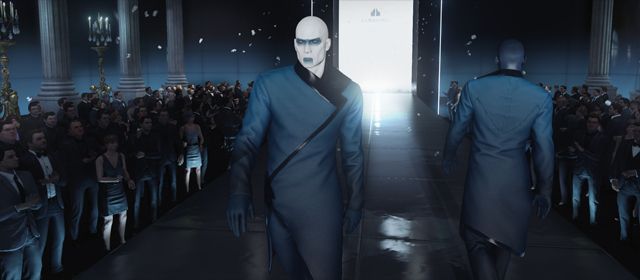 Dans le cadre d'un autre essai, cette fois-ci déguisé en serveur, on prend soin ne pas croiser trop longtemps les chefs d’équipes, qui connaissent leurs effectifs et leurs chemins de ronde. Rester trop longtemps dans leurs champs de vision nous fait apparaître comme suspect. Profil bas donc. Cet exemple n'est évidemment qu'une manoeuvre d'approche parmis des dizaines : on aurait pu se faire passer pour un agent de sécurité, un membre du staff du défilé qui se tient dans le pavillon, un membre de l'équipe pyrotechnique préparant le feu d'artifice qui doit clôturer la soirée, ou se faire carrément passer pour un mannequin qui nous ressemble étrangement et qu'on jurerait tout droit sorti de Zoolander . Ou même, pourquoi pas, pour le caméraman d'un duo de journalistes People faisant un reportage sur la soirée. C'est qu'une caméra piégée à l'explosif peut aussi être efficace... Créativité, liberté et multiplicité des approches : le sand box de Hitman est effectivement très généreux et tourne à plein régime, garantissant une vraie rejouabilité; d'autant que les sauvegardes ne sont pas automatiques. Jusqu'au bout donc, on garde le contrôle.