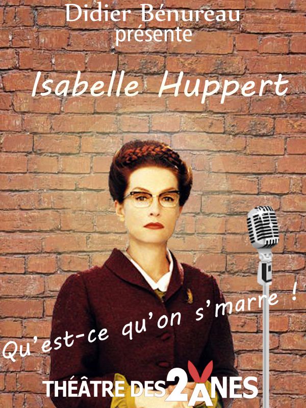 Pour ce premier spectacle, Isabelle Huppert a choisi de ne pas faire les choses à moitié : elle s'est tournée vers le petit théâtre parisien des 2 Ânes, temple de la comédie politique et potache, pour un show produit par Didier Bénureau. Au programme : des sketchs, bien sûr, mais aussi de l'improvisation et du music-hall, puisque l'illustre comédienne française a promis de dévoiler ses talents de musicienne, de chanteuse et de danseuse.