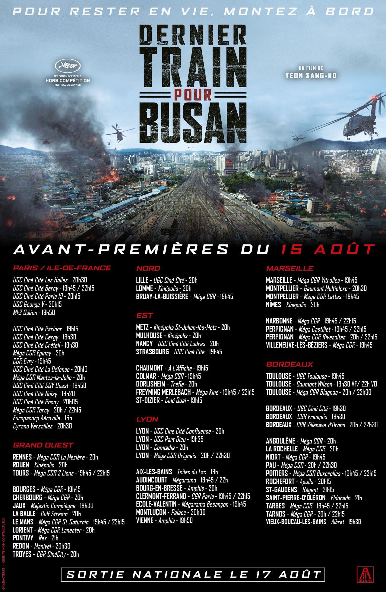 Réalisé par le sud-coréen Sang-Ho Yeon, Dernier train pour Busan se dévoile en avant-première dans toute la France ce lundi 15 août, l'occasion de découvrir une nouvelle pépite du cinéma coréen à mi-chemin entre 28 jours plus tard et Le Transperceneige. Lors de la projection du film en Séance de Minuit dans le cadre du dernier Festival de Cannes, une horde de zombies à été lâchée sur la Croisette. Ambiance horrifique et décontractée donc, d'autant plus que le long-métrage a reçu une standing ovation à la fin de sa présentation. Sortie officielle du film en salles prévue le 17 août.
