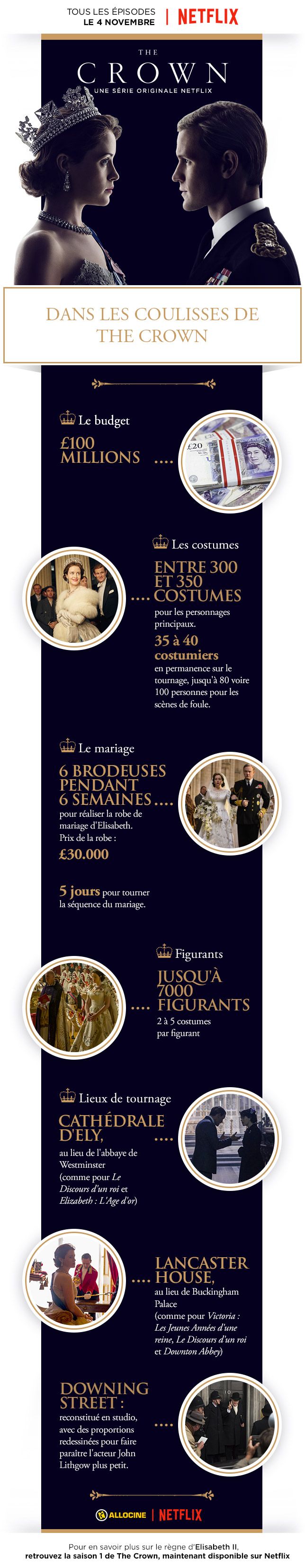 Avec 100 millions de dollars pour deux saisons, The Crown est la série la plus chère de Netflix. Le show, première création britannique originale de la plateforme SVOD, a joui d'un budget confortable pour raconter les premières années de règne de le Reine Elisabeth II. L'équipe de Peter Morgan - le créateur - n'a pas seulement travaillé sur la reconstitution de faits historiques mais a aussi tenu à apporter un soin tout particulier dans les costumes et les décors. Et les chiffres de cette infographie parlent d'eux-mêmes. Pour la petite anecdote, la robe de mariage portée par Claire Foy dans la série et cousue à l'identique que celle d'Elisabeth II aura coûté beaucoup plus chère que l'originale...
