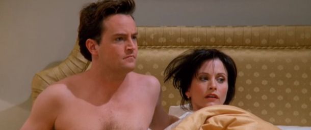 La veille du mariage de Ross et d'Emily à Londres, tout le monde est réuni pour un dîner. Entre les réflexions de sa mère et le fait qu'un homme ivre ait cru qu'elle était la mère de Ross, Monica abuse de l'alcool et broie du noir. Elle est persuadée qu'elle finira vieille fille. Comme à son habitude, Chandler prend soin de son amie et la réconforte... Et voilà, les deux amis qui finissent sous la couette ! On devinait depuis un moment que Chandler avait un petit faible pour Monica, mais les découvrir d'une scène à l'autre dans le même lit fut une énorme surprise !