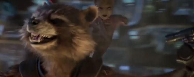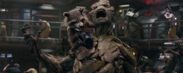 La furie meurtrière de Rocket Raccoon & Groot, volume 2 ! Dans la bande-annonce japonaise des Gardiens de la Galaxie 2, une courte séquence a été ajoutée à la vidéo dévoilée à l'international en fin d'année 2016 : on y découvre ainsi Baby Groot perché sur l'épaule du raton-laveur, toujours surarmé, sur un plan circulaire qui s'avère être la réplique exacte de la séquence de la prison des Gardiens de la Galaxie.