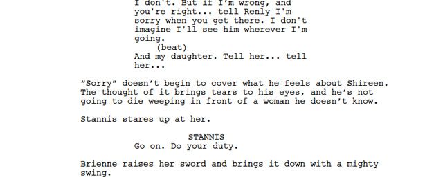 Il n'en fallait donc pas plus pour que certains téléspectateurs se laissent aller aux suppositions les plus folles et espèrent un retour du personnage dans un futur plus ou moins proche. Malheureusement pour eux, aujourd'hui le doute n'est plus vraiment permis puisqu'un script officiel du dernier épisode de la saison 5, qui vient d'être mis en ligne, explicite le sort de Stannis, via une scène rallongée et plus émouvante que celle que l'on a pu voir à l'écran. En effet, après un échange finalement retiré de la version définitive, durant lequel Stannis s'excuse de la mort de Renly et de Shireen, on peut lire la phrase "Brienne raises her sword and brings it down with a mighty swing" ("Brienne lève son épée puis l'abat avec un coup puissant"). Le terme "coup puissant" ne laisse plus de place à l'interprétation et nous permet donc de bien comprendre que Stannis n'aurait en aucun cas pu survivre à un tel coup d'épée.
