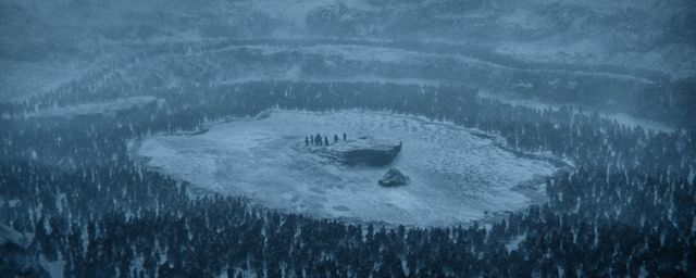 Accompagné de Jorah Mormont, de Gendry, de Tormund, du Limier, de Beric Dondarrion et de Thoros de Myr, Jon Snow s’aventure de l’autre côté du Mur dans le but de capturer un mort-vivant pour le ramener à Port-Réal et prouver à Cersei que Westeros court un énorme danger. Après avoir accompli leur mission, les membres de l’équipe se retrouvent encerclés par toute une armée de morts, sur un petit îlot, au milieu d’un lac. Lorsque les eaux gèlent, les morts attaquent à nouveau et s’apprêtent à massacrer tout le monde, quand arrivent Daenerys et ses dragons. Alors que le Roi de la Nuit tue Viserion d’un jet de lance, la Reine emmène les rescapés sur le dos de Drogon. Seul Jon Snow ne peut être secouru, et tombe dans les eaux glacées du lac. Après avoir réussi à fuir grâce à l’aide de Benjen Stark, il rejoint Fort-Levant tandis que les Marcheurs Blancs raniment le cadavre de Viserion.