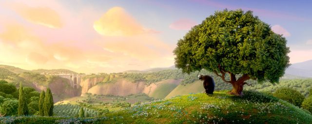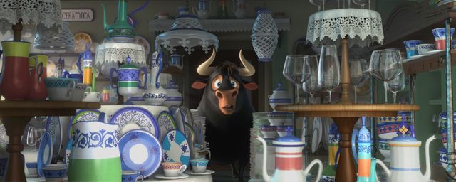 Thomas Cardone (chef décorateur) : Ferdinand est un gentil géant. C’est un énorme taureau noir. Il ne porte pas de costume, de motifs, ou quoi que ce soit qui puisse nous aider à décrire sa forme, donc quand il est à l’écran, il domine vraiment la composition de l’image. (…) Nous avons fait beaucoup d’efforts pour lui donner une grande envergure, des courbes rythmées qui devaient accompagner ses mouvements. Sa silhouette graphique était très importante, et ses courbes permettaient de créer un contraste avec les autres éléments du film. Par exemple, le matador El Primero est un personnage très droit et très vertical. (…) On a toujours envie que le style du film que l’on est en train de faire soit unique, que les gens, en regardant un plan de Ferdinand, puissent le reconnaître immédiatement. C’est toujours difficile de créer quelque chose de différent. Le niveau de caricature d’un film peut varier en fonction de ce que raconte l’histoire. Pour celui-ci, nous avons pensé qu’il nous fallait être un peu plus drôles. Nous ne voulions pas être réalistes, donc nous avons insufflé ces choses-là dans la couleur et dans les formes du film.