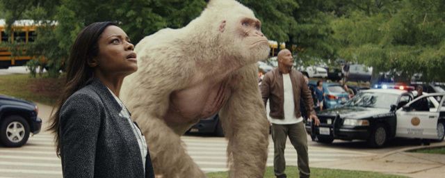 Naomie Harris : Les effets spéciaux ne sont pas ma tasse de thé ! Ce n’est pas évident de travailler dans un environnement artificiel où le plateau n’est parfois qu’un hangar vide avec un écran vert géant en toile de fond. C’est un sacré défi d’imaginer devant soi des monstres vous fonçant dessus ou de se trouver entourée de buildings qui s’effondrent ! Il faut être créatif et réceptif aux conseils lancés par le réalisateur et l’équipe des effets digitaux. Ma formation d’actrice, c'est de travailler face à d’autres acteurs et donc ici c’est une méthode de travail totalement différente. C’est comme une navigation en solitaire. Mais heureusement, Dwayne m’aide énormément dans ce processus puisqu’il a l’habitude des grosses productions hollywoodiennes et des films catastrophes.