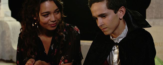 Une fois au cimetière, Jessica a du mal à cacher le fait qu'elle n'est pas rassurée. Elle craint de passer pour une grosse froussarde auprès de Mathias, mais ce dernier s'en fiche. Il est tout simplement content qu'elle soit là, avec lui. Et c'est tout naturellement que les deux lycéens échangent un baiser. Puis un second, plus fougueux. Mais leur rapprochement est interrompu par Karim, qui leur rappelle qu'il est interdit d'entrer dans un cimetière en pleine nuit et leur demande de rentrer chez eux.