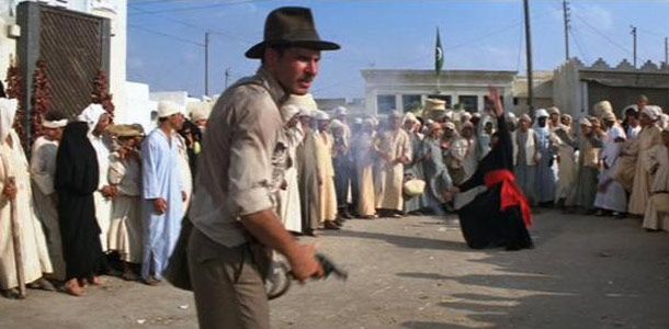 Dans les Aventuriers de l'Arche perdue, Harrison Ford se lance à la recherche de Marion, Kidnappée. Il tombe alors face à un Bad Guy vraiment vraiment (oui oui, deux fois) méchant, faisant des moulinets avec un monstrueux cimeterre. Autant dire que le bon vieux Dr. Jones va finir, au mieux, coupé en deux. Sauf que notre archéologue préféré sort son revolver et lui tire à bout portant. Une balle. Le colosse s'écroule aussi sec.