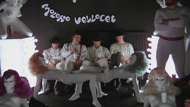 Sur la musique funèbre composée par Purcell pour la reine Mary dans la séquence d'ouverture d'Orange mécanique, la caméra de Stanley Kubrick filme en plan fixe le visage d'Alex (Malcolm McDowell). Regard ultra inquiétant, vicieux et hypnotique : on comprend que c'est lui qu'il faut craindre. Avant que la caméra ne fasse un travelling arrière, nous révélant ses Droogies. Ils rechargent leurs batteries avec un verre de Moloko Plus au Korova Milk Bar, avant de se lancer dans une bonne petite séance d'ultraviolence...