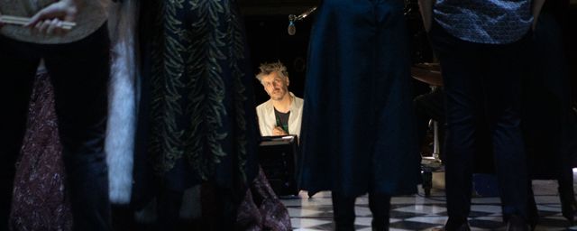 Dans la mise en scène, pas tant que ça. Sauf que si. C'est pas vrai. Parce que Claude Mathieu, qui est la doyenne, quand on a repris les répétitions, nous a dit qu'elle était à un âge auquel elle ne pouvait pas se permettre de répéter sans masque. Je lui ai donc répondu qu'elle serait quand même dans le spectacle, car on projetterait le mort de la grand-mère, que vous avions tournée pendant l'été. C'est un épisode très important de "Du côté de Guermantes", et on n'avait pas prévu que ce soit de la vidéo.