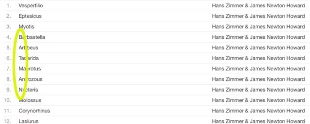 Mais c'est surtout lorsqu'on les lit à la verticale, et de haut en bas (à la manière d'une chauve-souris dormant la tête à l'envers), qu'on peut y découvrir un easter egg de première classe. En effet, en prenant la première lettre de chaque piste (de la quatrième à la neuvième), on peut tout simplement lire le mot : B-A-T-M-A-N