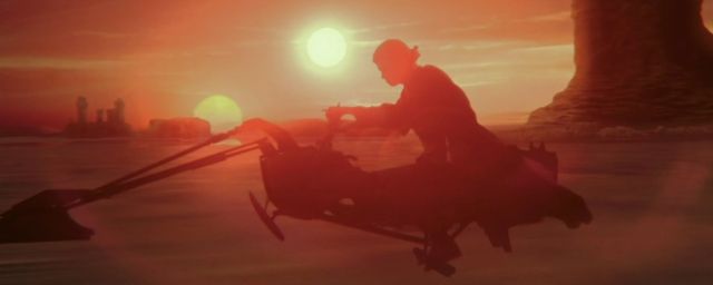 Lors d'une séquence inoubliable, portée par l'épique partition d'un John Williams particulièrement inspiré, le jeune Jedi enfourche alors un speeder et s'élance à travers les dunes de Tatooïne, défiguré par la colère et par un incontrôlable désir de vengeance. Sous les rayons rouges des deux soleils couchants, il traverse des canyons, sillonne des plaines, interroge des témoins Jawas.