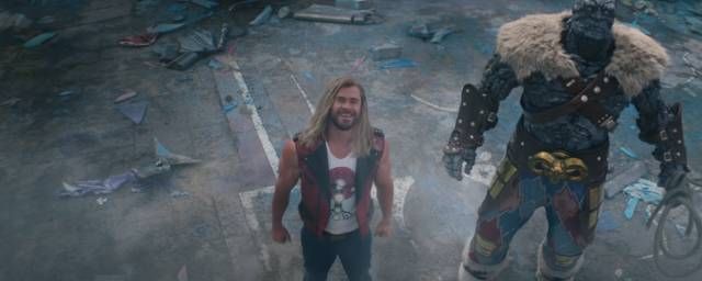 De droite à gauche, nous distinguons en effet Korg, Thor et… une troisième personne avec une cape rouge et une allure proche de celle du fils d'Odin. Qui peut donc être Jane ou Beta Ray Bill. Au vu de la carrure du personnage mystère, qui paraît assez proche de celle de Chris Hemsworth sur l'image, il se pourrait même qu'il s'agisse de ce dernier. Réponse le 13 juillet au plus tard.