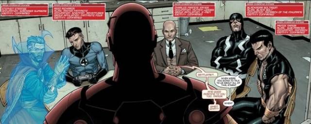 Dans les comics, l’existence des Illuminati a été révélée dans le 7e tome de New Avengers, publié en 2005. La vocation de l’assemblée n’y est pas tant de combattre ensemble mais plutôt de coordonner les actions de leurs différentes équipes.