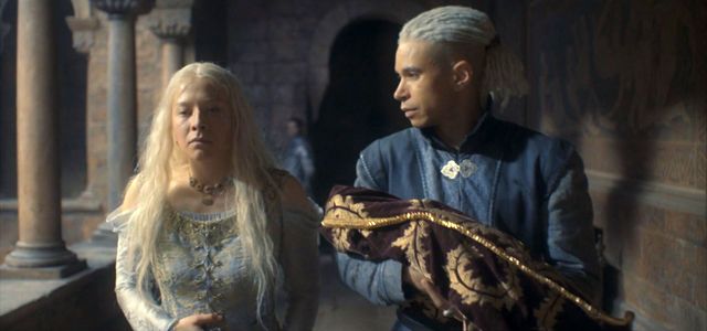 Au Conseil du Roi, Alicent et Rhaenyra poursuivent leur mode de conversation passif-agressif. Elles discutent des affaires du royaume en s’envoyant des piques. Mais Rhaenyra adresse les dissensions entre la Reine et elle. Pour calmer le jeu et éviter un carnage, elle propose à son ancienne amie une alliance : le mariage de son fils Jacaerys, futur héritier du trône, avec Helaena la fille d’Alicent et Viserys. Évidemment, on n’abordera pas la question de la morale ou de la consanguinité ici.