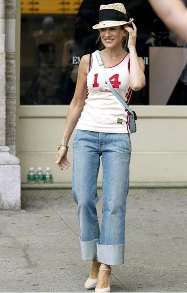 Sarah Jessica Parker en jean à revers et chapeau de paille dans Sex § the city.