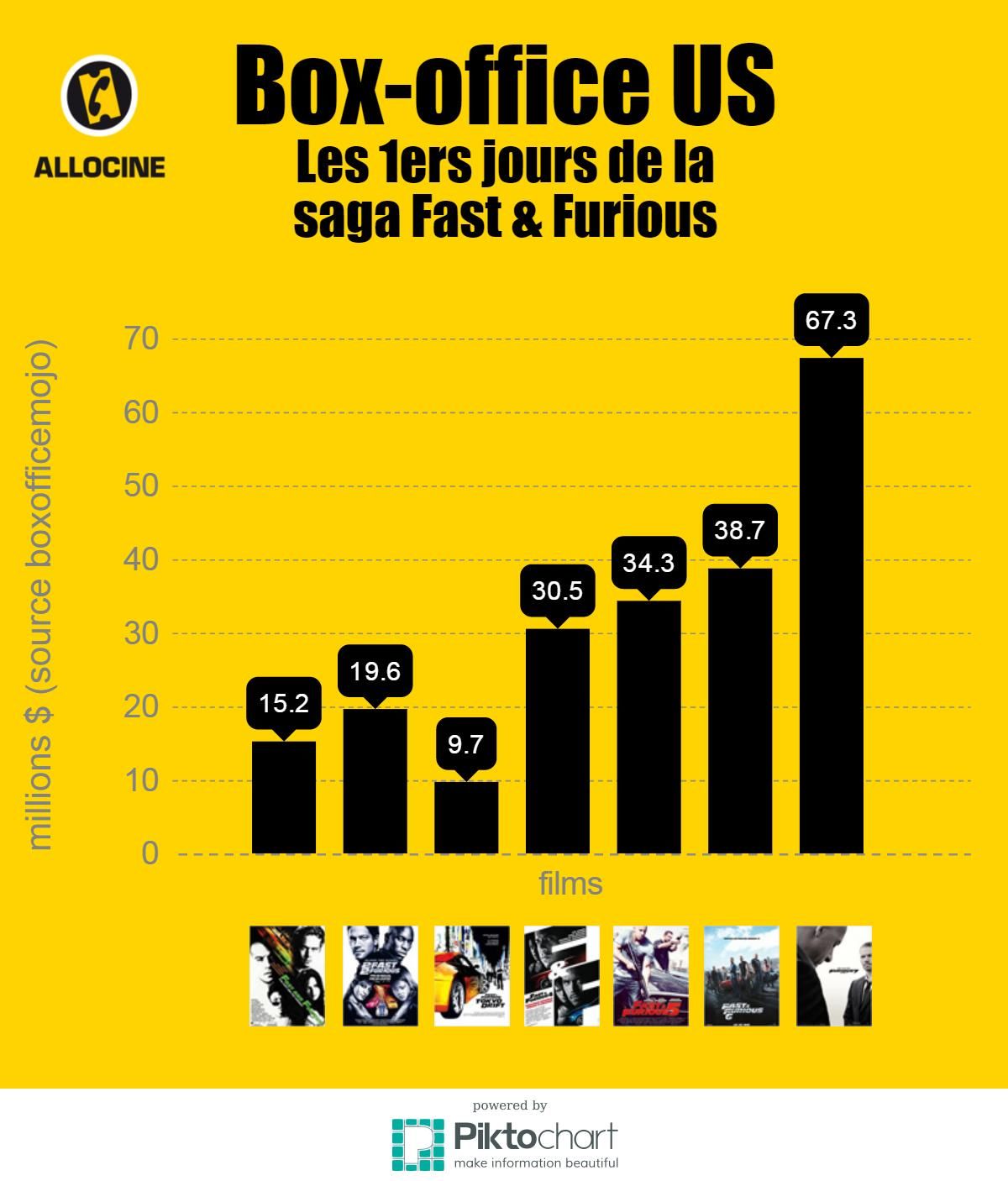 Tous les pronostics annoncent donc un premier week-end record pour Vin Diesel et ses compagnons de route, qui pourraient inscrire "Furious 7" au panthéon des meilleurs démarrages de tous les temps. Symbole de ces débuts fracassants : le film engrange en un petit tour de piste plus de recettes que Fast & Furious : Tokyo Drift en... 14 semaines d'exploitation. En 2006, le "pas vraiment troisième épisode" avait ainsi terminé sa carrière outre-Atlantique à 62,5 millions de billets verts.