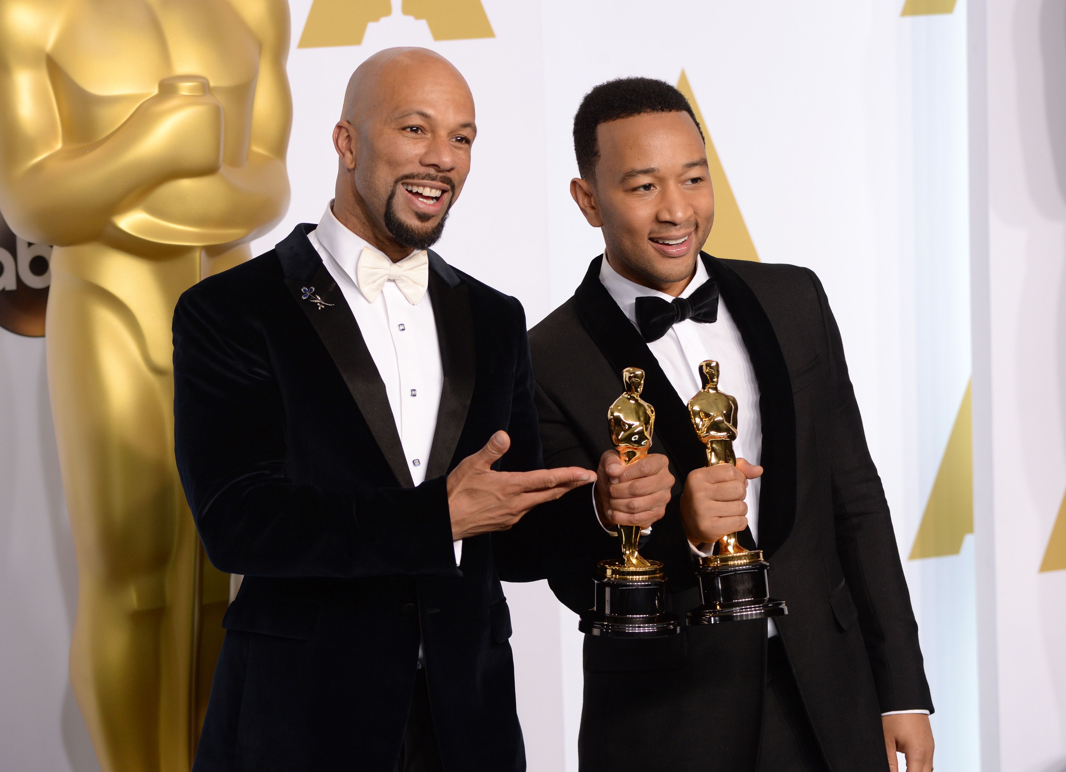Common, John Legend - Press Room lors de la 87ème cérémonie des Oscars à Hollywood, le 22 février 2015.