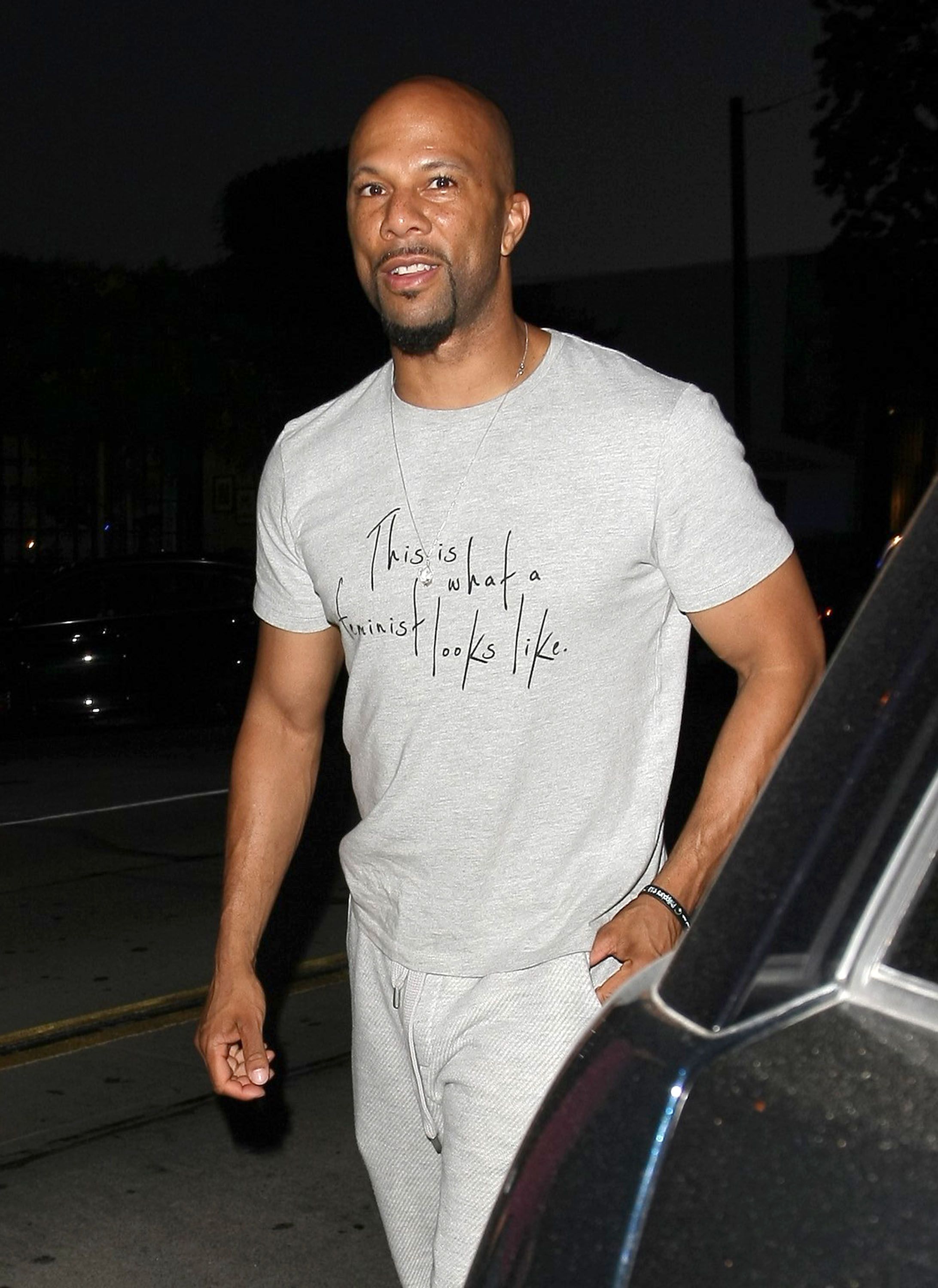Common porte un t-shirt à message en allant dîner au restaurant Gracias Madre à Los Angeles le 23 juillet 2015.