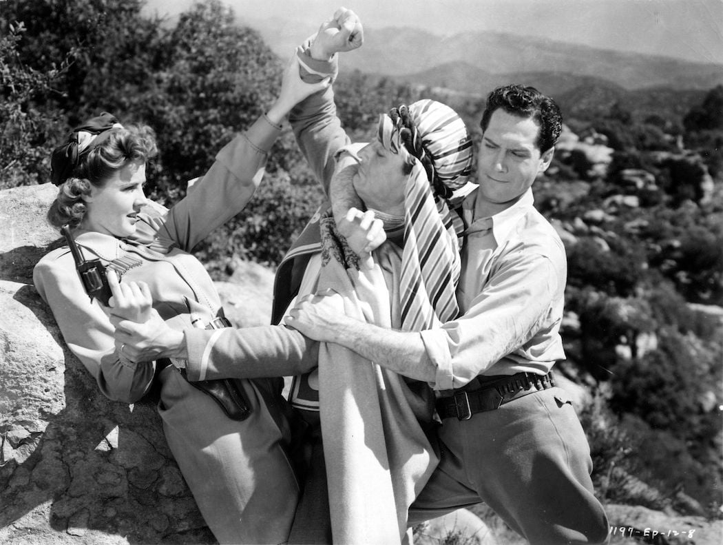 Terry et les pirates est en fait un Serial, adaptation d'un Cartoon Strip très populaire dans les années 30. Terry Lee (à droite sur la photo, incarné par William Tracy) est un archéologue aventurier, cherchant à déchiffrer d'anciennes inscriptions avec l'aide de son fils. Exotisme vaguement asiatique, méchants très méchants et prêtresse fatale se donnent rendez-vous dans le film. Très populaire, le personnage de Terry Lee fera aussi l'objet d'une série TV diffusée en 1952 aux Etats-Unis.