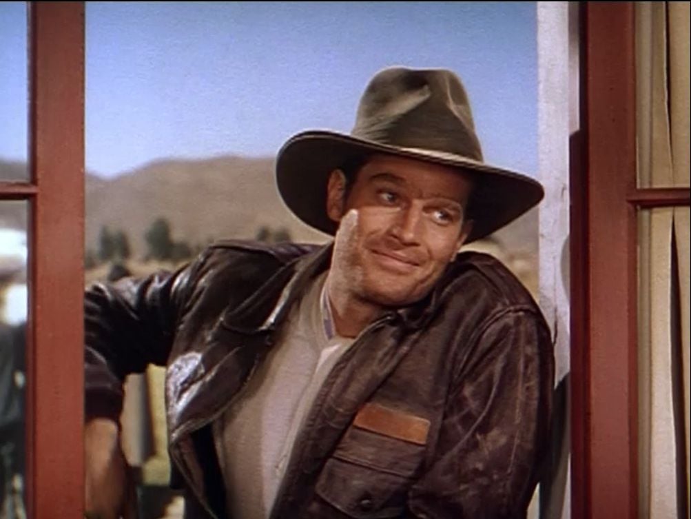 Avant d'enfiler la tunique de Ben-Hur, Charlton Heston jouait les aventuriers dans la jungle péruviennes à la recherche d'un fabuleux trésor dans Le Secret des Incas. On se dit que George Lucas a bien dû visionner le film, tant la panoplie de Heston jette les bases de celle du futur Indiana Jones : barbe de trois jours, veste en cuir et Fedora au menu...