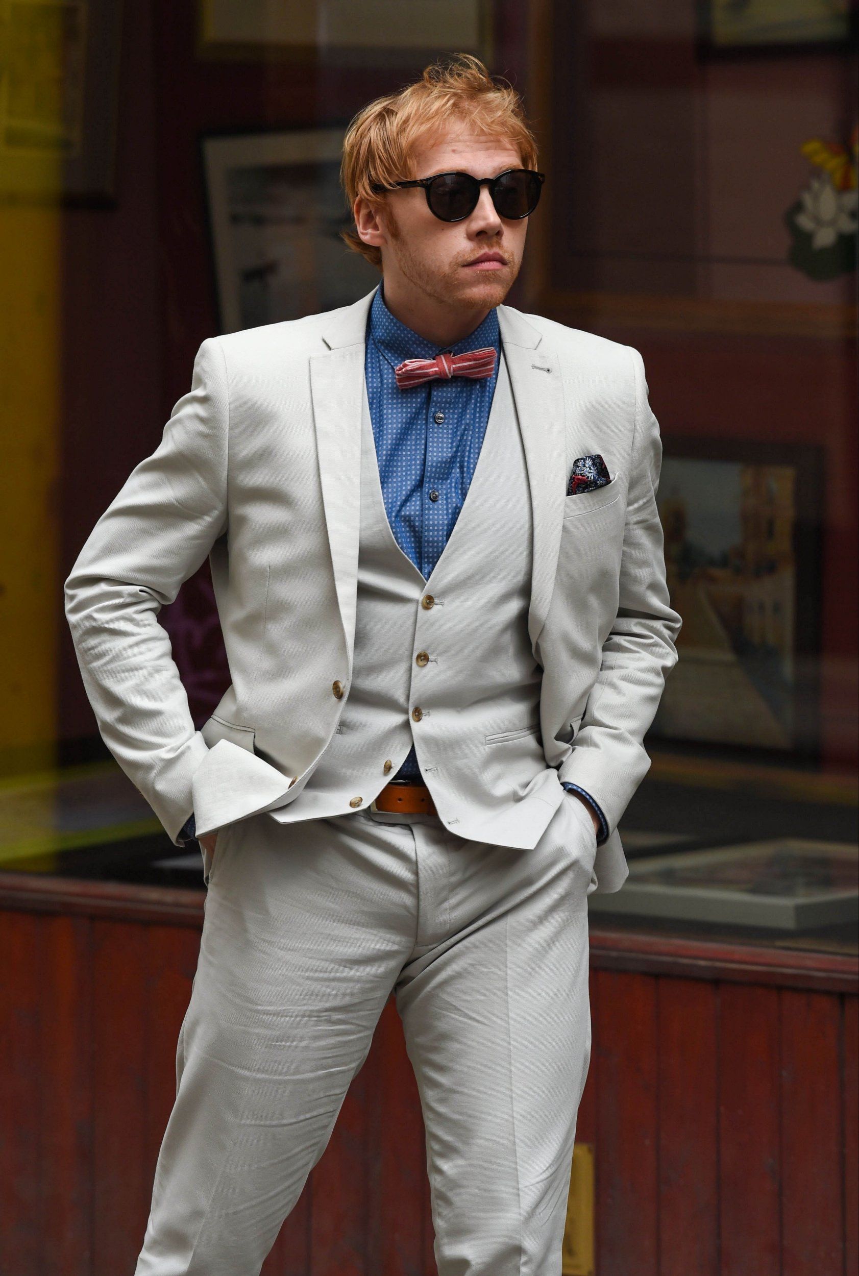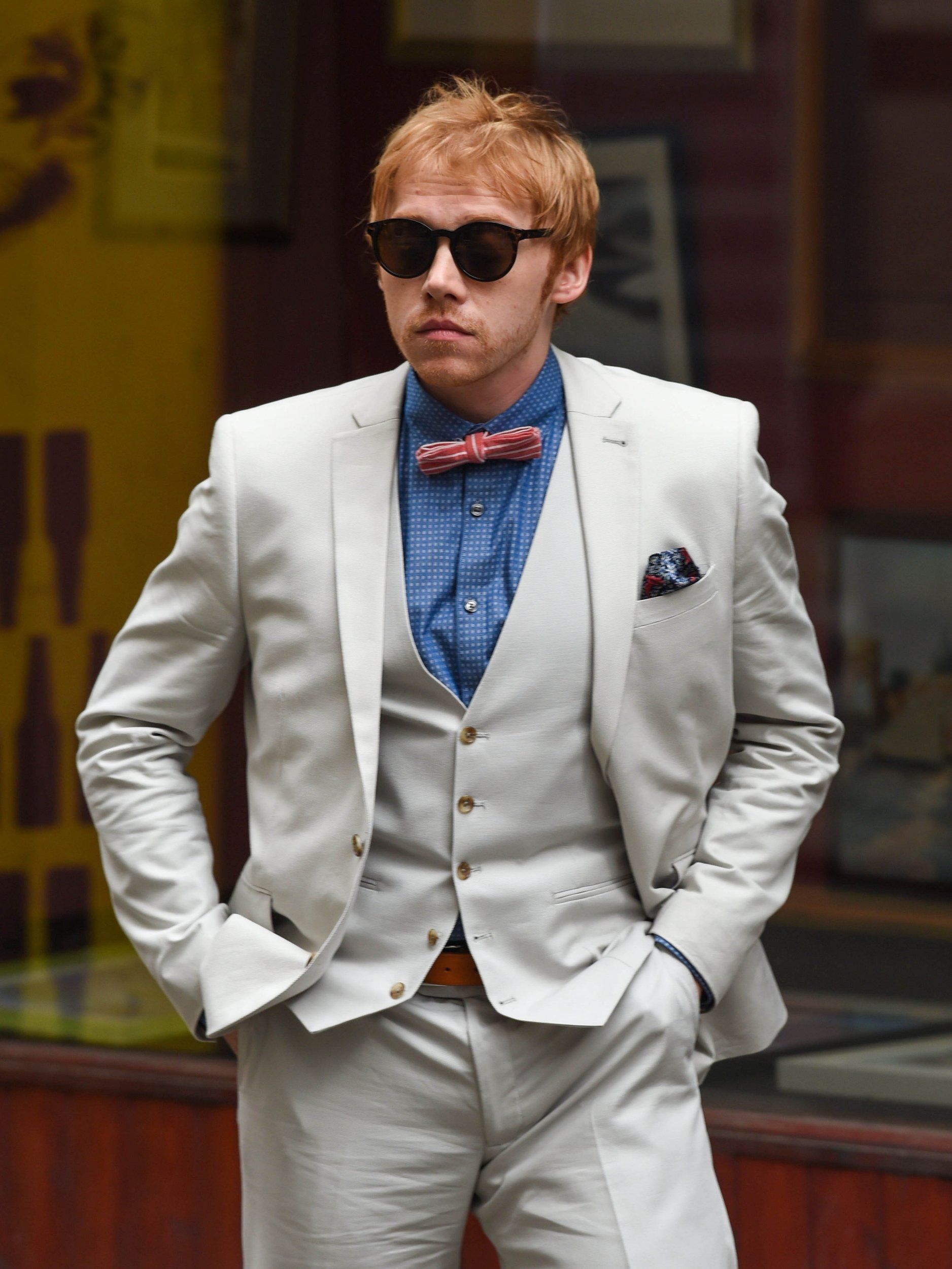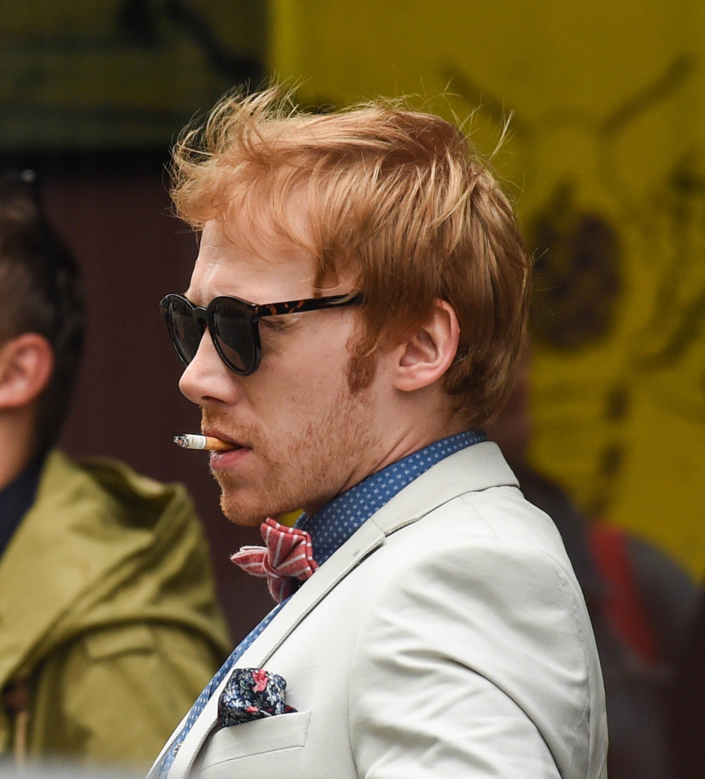 Costume trois pièces clair, nœud pap rouge et pochette à fleurs, Rupert Grint est devenu le roi de la classe sur le tournage de la série Snatch pour la plateforme en ligne Crackle ! Les premières photos ont été dévoilées par le site Metro. Avec ses lunettes noires vissées sur les yeux et sa clope au bec, le petit Ron Weasley de la saga Harry Potter a décidément bien changé de look.