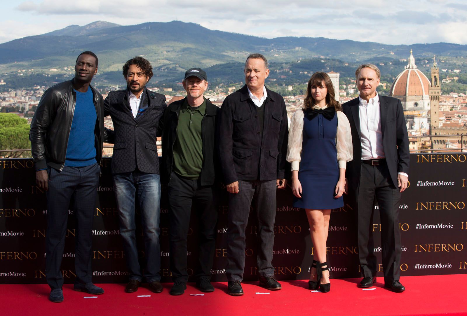 L'équipe d'Inferno lors du photocall organisé à Florence en Italie, où se déroule en grande partie l'action du film. Dans le 3ème film adapté de l'oeuvre de Dan Brown, Robert Langdon suit la piste d’indices liés au grand Dante lui-même. L'expert en symbiologie se réveille dans un hôpital italien, frappé d’amnésie, et va devoir collaborer avec le docteur Sienna Brooks pour retrouver la mémoire. Tous deux vont sillonner l’Europe dans une course contre la montre pour déjouer un complot à l’échelle mondiale et empêcher le déchaînement de l’Enfer…