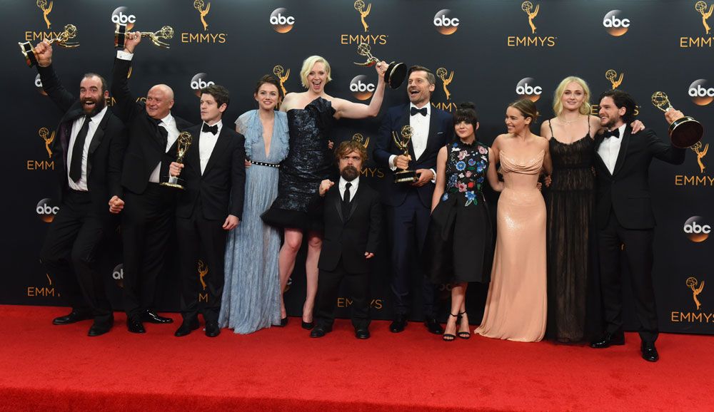 En septembre 2016, toute l'équipe de GOT était réunie pour recevoir l'Emmy de la Meilleure Série. Rory McCann, Conleth Hill, Iwan Rheon, Gwendoline Christie, Peter Dinklage, Nikolaj Coster-Waldau, Maisie Williams, Emilia Clarke, Sophie Turner et Kit Harington... Une belle brochette !