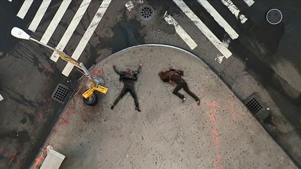 Quand Dwayne Johnson et Samuel L. Jackson ont trop pris la grosse tête, ils se croient invincibles et sautent du toit d’un immeuble, en pleine course poursuite. Tour de force méta : Dwayne Johnson s’est cassé la gueule.