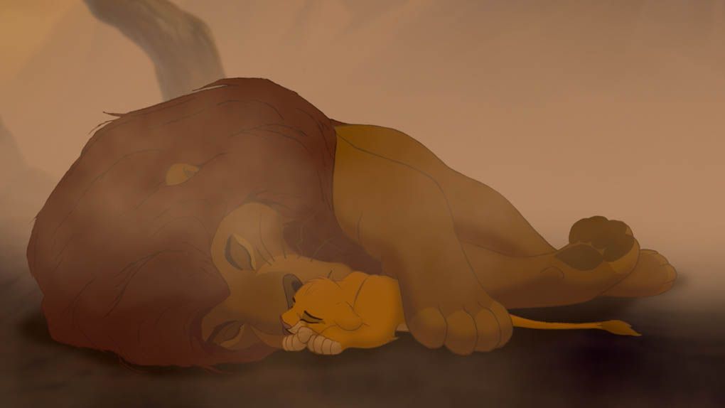 Terrassé par un troupeau de gnous, le Roi Lion s'effondre au sol et ne se relèvera plus. Simba aura beau tenter de le réveiller, l'appeler d'une voix implorante et pleurer toutes les larmes de son corps, son père le surveille désormais du haut du ciel.