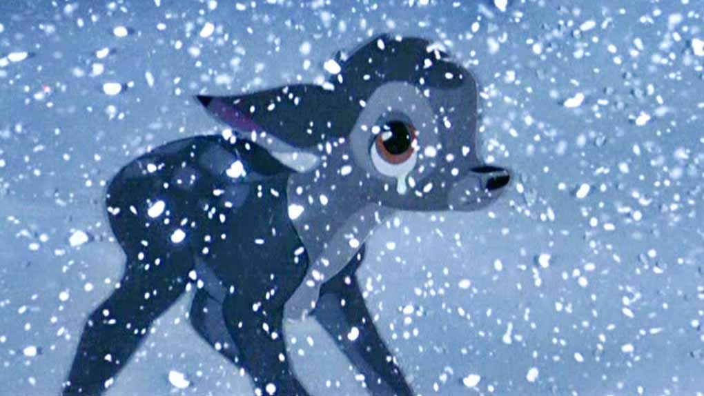 Un seul et unique coup de fusil aura suffi pour faire basculer l'existence du pauvre petit faon. Privé de sa mère, son monde s'est écroulé, et tandis que la neige se met à tomber, des générations entières de spectateurs traumatisés sanglotent à ses côtés.