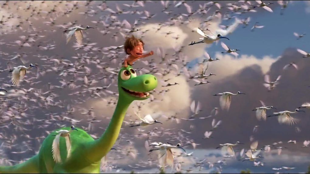 En courant à travers les plaines préhistoriques du Voyage d'Arlo, le petit dinosaure et son ami humain font s'envoler des milliers d'oiseaux blancs.
