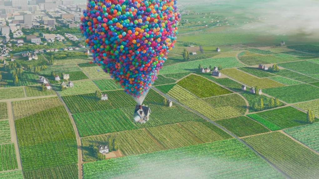 Après avoir décollé dans sa maison-montgolfière, Karl Fredricksen dit au revoir de Là-haut à sa ville et à sa morne existence en jetant un oeil par la fenêtre.