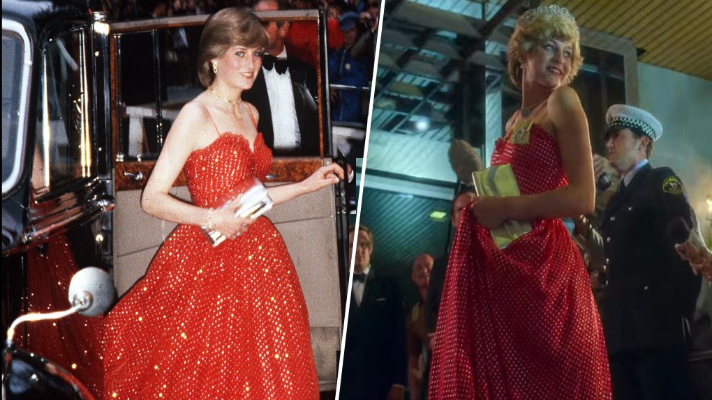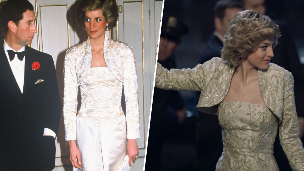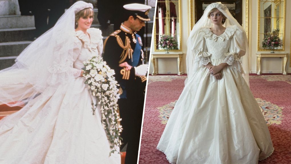 Diana s'est offert une véritable robe de princesse en taffetas et en soie, composée d'une traîne de 25 mètres de long (qui s'est malheureusement froissée avant son arrivée à l'église). Les costumiers de The Crown ont cousu une réplique quasi identique. Une robe que l'actrice Emma Corrin ne portera que dans une seule scène, puisqu'il n'y a aucune image du mariage dans la série.