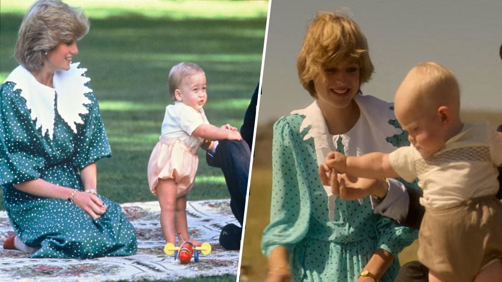 Une photo (à gauche) prise en décembre 1982, alors que la jeune princesse se rend à l'opéra. La robe de la série est identique, jusqu'à la broche et les bijoux qui complètent ce look.
